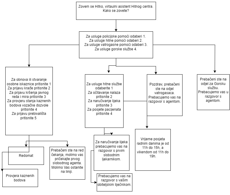 Veliki broj ljudi svakodnevno ukazuje potrebu za hitnim službama. Obzirom da većina slučajeva nije hitna mi smo planirali razviti chatoba koji bi razlučio što je hitno i nakon toga prebacio na direktnu službu poput policije, vatrogaca i hitne. Slučajevi koji nisu hitni chatbot bi probao sam riješiti ili uputiti na neku web stranicu ili drugu službu. Na primjer zahtjev za produženje osobne iskaznice ili promjenu prebivališta...